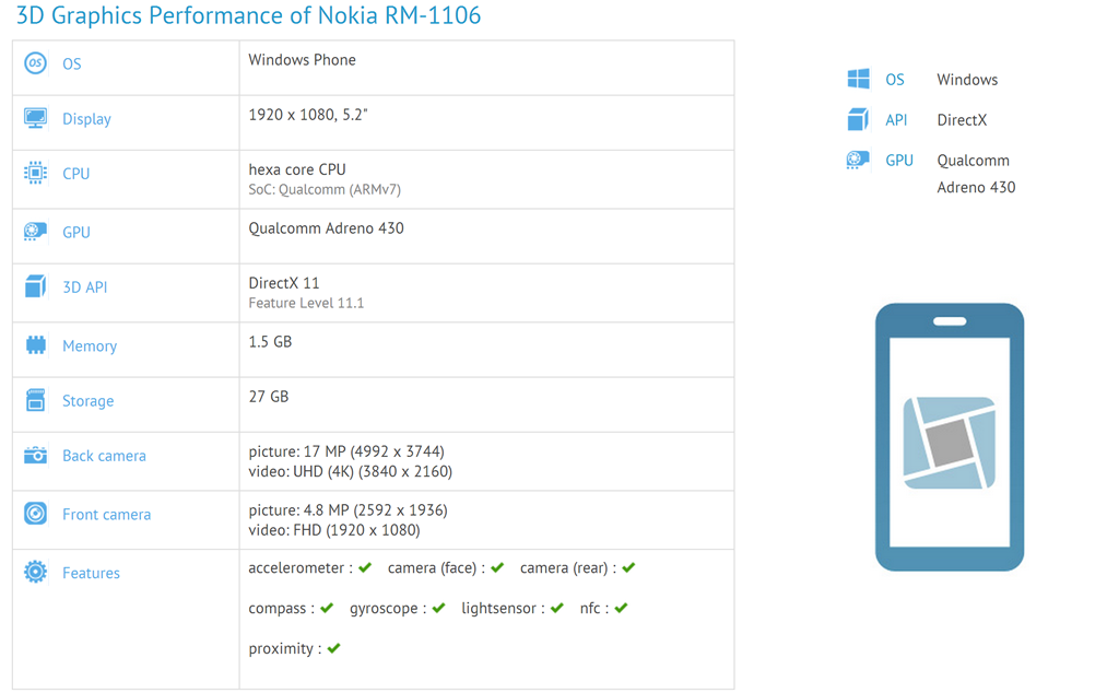 Dincolo de asta, o intrare pe site-ul GFXBench (Nokia RM-1106 ) ne arată că benchmark-ul a fost rulat pe un aparat Windows Phone cu display de 5.2 inci și rezoluție 1920 x 1080, cu un CPU hexa core (SoC: Qualcomm), cameră de 17 MP, 32 GB pentru stocare și probabil 3 GB RAM.