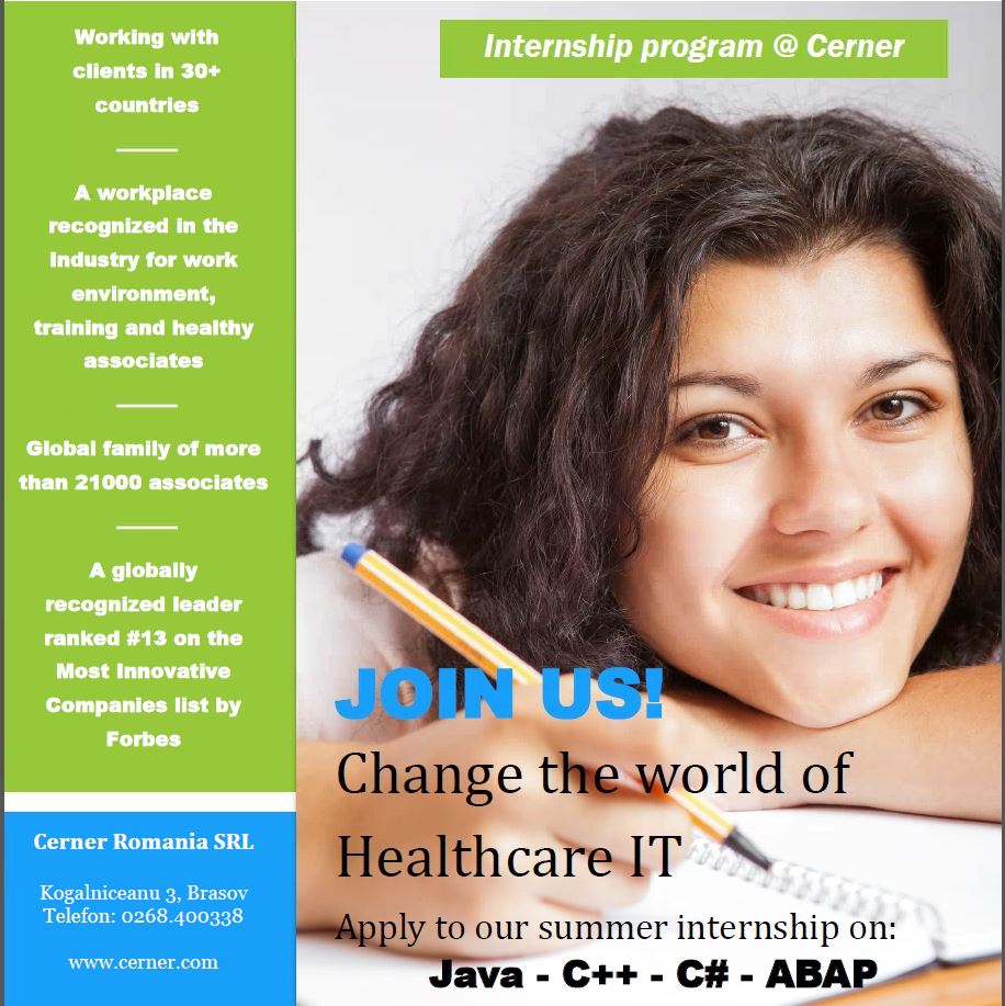Sub sloganul ”Faceți parte din ceva ce contează și schimbați lumea healthcare IT”, Cerner Romania anunță că a dat drumul la programul de internship pentru perioada verii – se caută persoane interesate să lucreze part-time, plătit și să învețe Java, C++, SQL, SAP Abap, Project Management, în ideea că ulterior vor deveni parte a echipei Cerner.