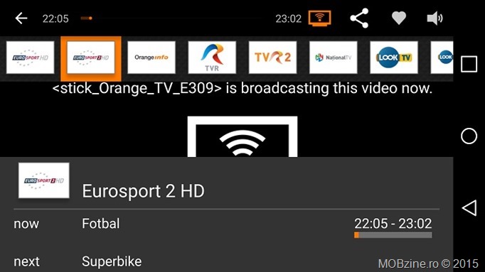 Stick-ul este văzut, se fac setările de rigoare în mod automat și ansamblul e pregătit pentru a fi folosit. Înseamnă că porniți aplicația Ornage TV Go de pe telefon, selectați canalul pe care vreți să îl urmăriți și apoi îl trimiteți (apăsați pe butonul ce are un icon cu un televizor) către stick-ul Orange TV.