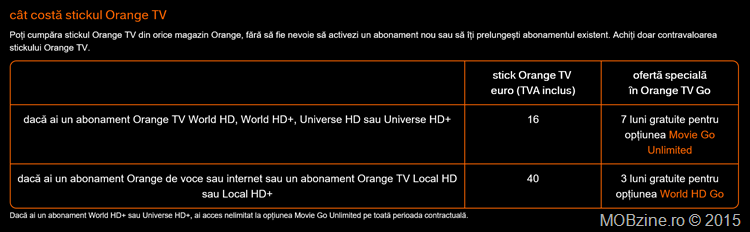 Dincolo de abonamentul Orange TV și serviciul Orange TV Go e nevoie să cumpărați și stick-ul Orange TV. Îl puteți lua la 16 EUR sau 40 EUR, depinde de ce alte servicii Orange mai folosiți.