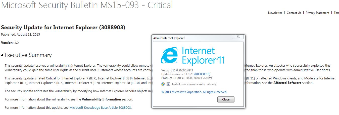 Toți cei ce folosesc (sau au) Internet Explorer pe sisteme sunt sfătuiți să aplice rapid patch-ul Microsoft Security Bulletin MS15-093 – Critical pentru că e descoperită o vulnerabilitate 0day care permite rularea de code de la distanță dacă browser-ul deschide o pagină web ce conține cod special făcut. Vulnerabilitatea afectează toate versiunile de Internet Explorer de la 7 încoace, inclusiv 11.