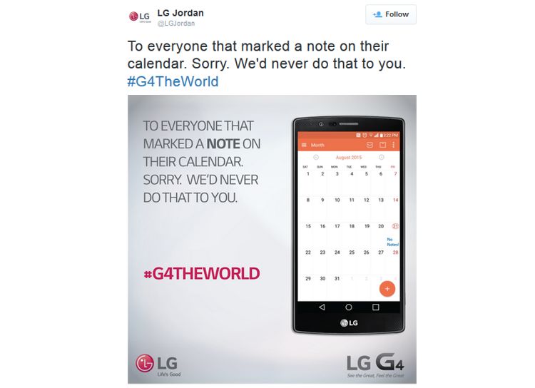 În încercarea de a arăta că din perspectiva LG, fanii nu merită niciodată un asemenea tratament, pe contul de Twitter al LG Iordan a fost publicată următoarea fotografie cu o aluzie (bolduită) la cum își tratează compania fanii.