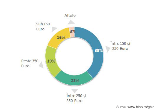 Care sunt salariile cu care sunt remunerati studentii la primul lor job? In urma studiului realizat de Hipo.ro privind Piata fortei de Munca in 2015 a reiesit ca 39% dintre absolventii promotiilor anterioare au declarat ca la primul job full-time au avut un salariu net cuprins intre 150 si 250 euro, 23% dintre ei intre 250 si 350 euro, in timp ce 19% au avut salarii peste 350 euro, iar 16% salarii sub 150 euro.