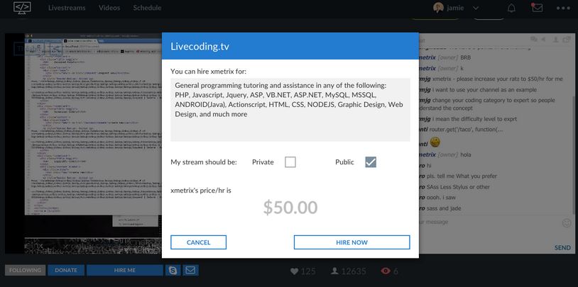 Live Coding a introdus o idee cel puțin interesantă: aceea de a permite unui angajator să vadă cum și la ce lucrează un programator pe care l-a anagajat prin Live Coding. Pe scurt treaba se întâmplă așa: dacă un programator e listat în serviciu, el își oferă timpul și capabilitățile celui ce vrea să plătească.