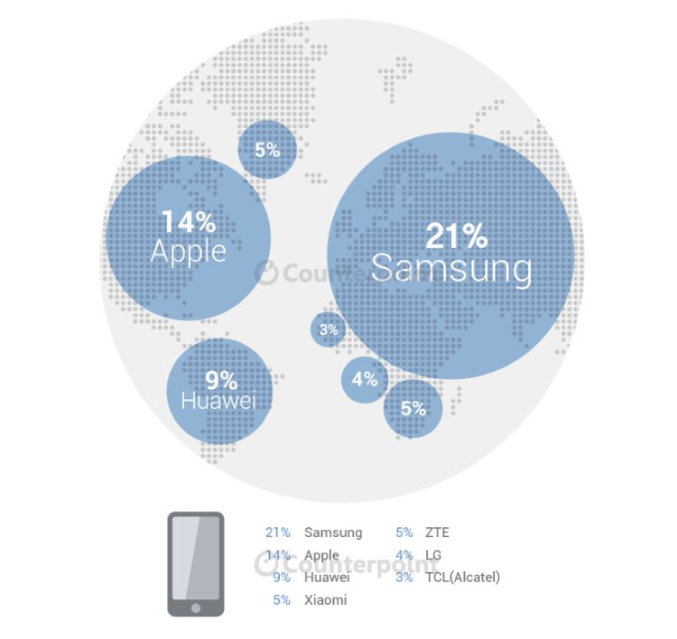 Cel mai recent studiu care confirmă acest lucru este cel realizat de către Counterpoint Research, care a totalizat livrările de terminale mobile pentru perioada aprilie – iunie 2015, al doilea trimestru al anului. Pe zona de smartphone, acolo unde lucrurile sunt interesante și pentru noi, Samsung deține supremația cu o cotă de piață de 21 de procente. Apple, rivalul etern, este pe locul al doilea, cu 14% din piață, în timp ce Huawei ocupă cea de-a treia poziție a podiumului, cu 9%. Urmează, cu câte 5%, Xiaomi și ZTE. LG completează top 5-ul cu 4% cotă de piață. Surpriza, din punctul meu de vedere, vine de la brand-ul care ocupă poziția a șasea a acestui clasament global, deținută de Alcatel (TCL), un nume care se bucură de o popularitate chiar mai mare pe continentul nord-american.