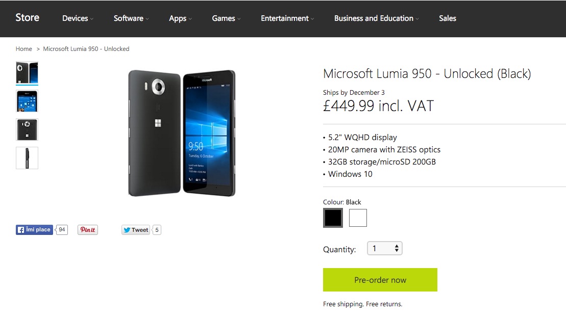 Fără o dată clară de lansare și/sau livrare Microsoft a decis să deschidă precomenzile pentru noile sale flagship-uri Lumia 950 și Lumia 950 XL. Drept urmare pe MS Store UK și Italia cele două produse pot să fie deja comandate de către cei interesați. Ceea ce mi se pare interesant este prețul: 599 EUR pentru Lumia 950 respectiv 699 EUR pentru modelul Lumia 950 XL. În lire englezești înseamnă Lumia 950 la £449.99 respectiv Lumia 950 XL la £529.99.