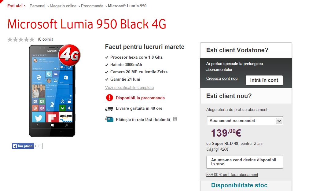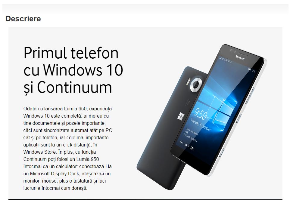 Avem o veste bună pentru toți cei interesați de achiziționarea noului Lumia 950 în România: Vodafone l-a scos la precomandă, cu un preț începând de la 559 EUR la liber sau 139 EUR la abonamentul RED 49.