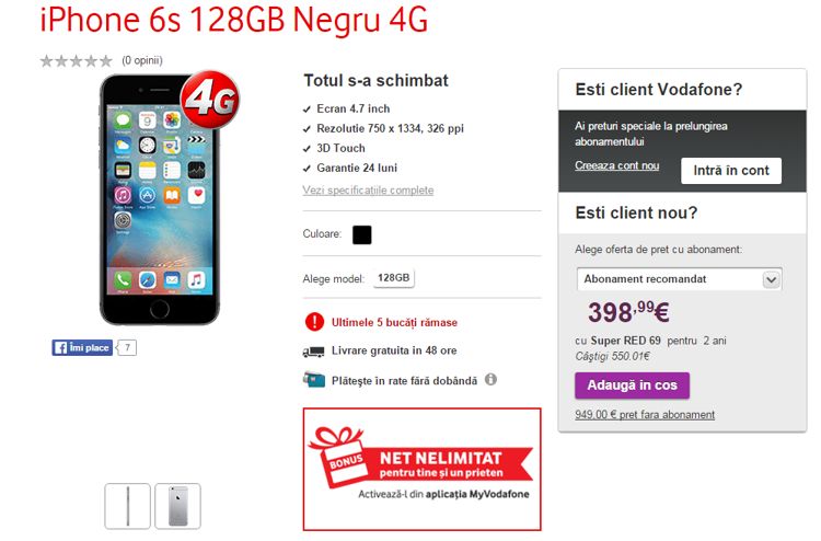 Păi din prețuloiul ăsta să tot faci reduceri de 21%. Prin comparație, în România, în oferta Vodafone, același iPhone 6s cu 128 GB costă 1030 dolari (949 euro).