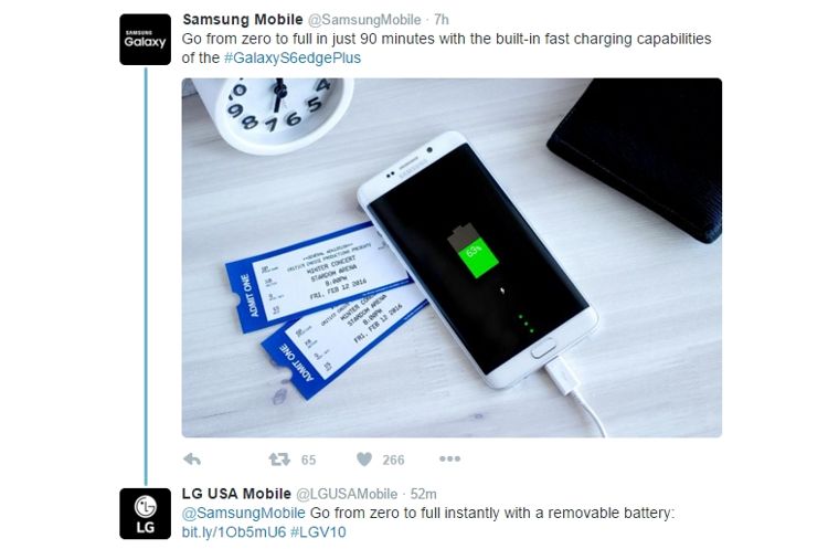 Exemplul concret de astăzi este mesajul de pe Twiiter al celor de la Samsung Mobile, care, în încercarea de a promova capacitatea de încărcare rapidă a acumulatorului de pe Samsung Galaxy S6 edge Plus, au venit cu mesajul comercial: “from zero to full in just 90 minutes”. Replica celor de la LG Mobile mi s-a părut una genială: “Go from zero to full instantly with a removable battery”. Evident, miza este dată de duelul de la distanță pe care Samsung Galaxy S6 edge Plus îl are cu LG V10, duel care s-a mutat și la nivelul departamentelor de comunicare ale celor două companii.