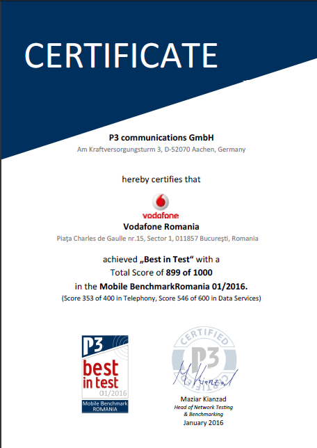 Pentru al doilea an conscecutiv Vodafone Romania a primit certificarea P3 Communications Best in Test in Romania pentru serviciile de date și telefonie mobilă. Mai mult, Vodafone a obținut cel mai mare scor dintre toate campaniile de certificare desfășurate în 2015 de către P3 Communications în Europa, nu numai cele din România.
