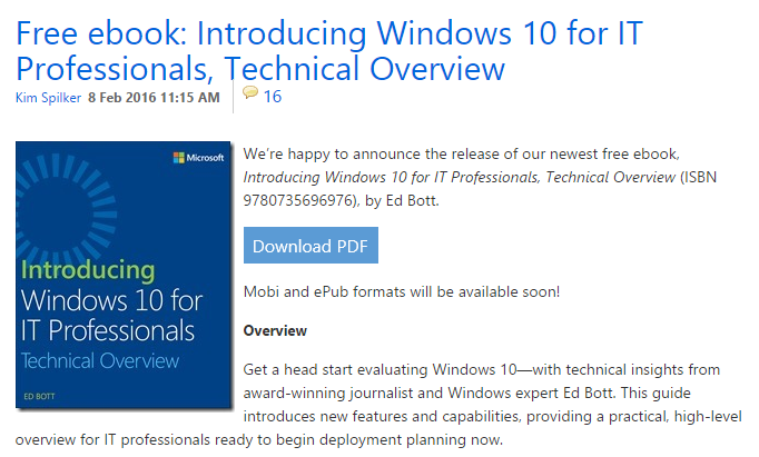 Vă recomand să descărcați și să vă uitați pe ”Introducing Windows 10 for IT Professionals, Technical Overview”, o carte scrisă de Ed Bott, editor la ZDNet. Este oferită în regim gratuit de către Microsoft Press, doar în format PDF deocamdată.