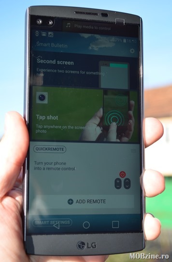 Pe LG V10 veți găsi o primă implementare a unui concept interesant: două ecrane. Pe lângă ecranul clasic, de 5.7 inci IPS (1440 x 2560 pixeli) LG a mai pus unul (chiar lângă cele două camere frontale) de 2.1 inci și cu o rezoluție de 160 x 1040 pixeli, capabil să funcționeze și independent.