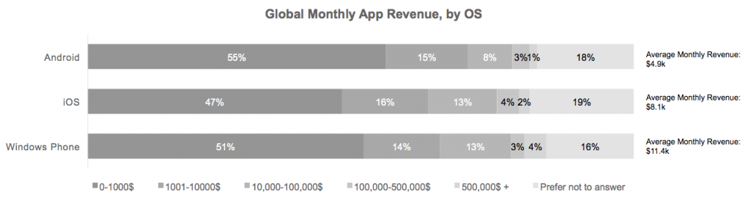 Situația cu veniturile în funcție de sistemul de operare pentru care se dezvoltă aplicația este una extrem de interesantă.