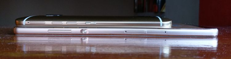 Huawei P8max are o costrucție de tip unibody, metalică, destul de pătrățoasă. Sau, cel puțin așa am perceput eu colțurile sale, posibil și din cauza dimensiuni. Nu sunt foarte prieten cu acest tip de construcție, cu spatele totat plat, îmi place mult mai mult curbura de pe spatele lui One M9 de exemplu (și o să vedeți pe parcursul acestui material că am căzut destul de des pradă tentației de a compara cele două telefoane, mai ales că erau amândouă aurii), însă atenția la finisaje a compensat din plin. Pornind de la îmbinările dintre rama metalică și sticla ecranului, la cele două ușițe pentru SIM și microSD, lucrurile chiar arată bine.