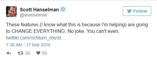 Pentru ca ceva mai târziu Scot Hanselman să preia mesajul și să ne transmită că noile funcții ce vor fi prezentate la BUILD 2016 au puterea să „SCHIMBE TOTUL”.