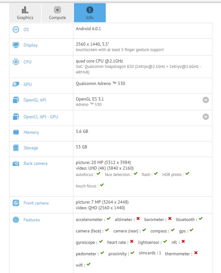 O combinație de chipset Qualcomm Snapdragon 820, ecran QHD de 5,5 inchi și memorie RAM de 6 GB nu are cum să nu arate bine! Dacă adăugăm o stocare internă de 64 GB, un Android 6.0.1 Marshmallow, o cameră foto principală de 21 megapixeli, una dedicată selfie-urilor de 8 megapixeli, avem imaginea destul de clară a unui adevărat flagship killer (se aude OnePlus?). Iar leak-ul de specificații din GFXBench pare să confirme aceste specificații.