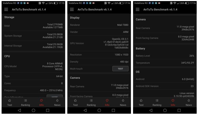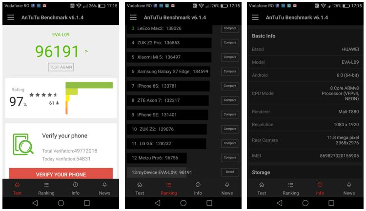 Privite din perspectiva opusă, cea a programelor de tip benchmark, performanțele etalate de Huawei P9 sunt discutabile. Mie nu îmi plac comparațiile de cifre, cred că am spus-o de atâtea ori, ele nu reflectă în mod obligatoriu realitatea (cea care, până la urmă, contează cu adevărat). Cu toate acestea, am rulat un AnTuTu Benchmark, pentru cei dornici de clasamente și dueluri indirecte între telefoane. Vedeți mai jos ce a ieșit.