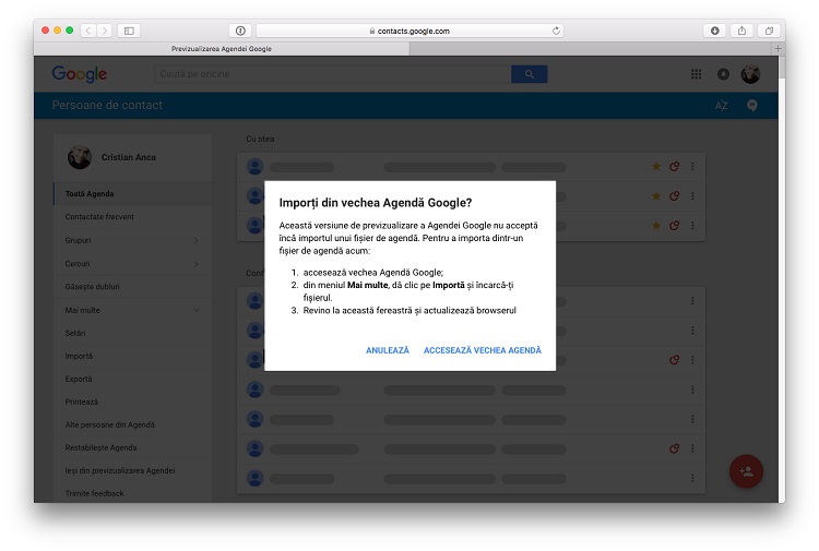 8. În interfața nouă Google nu oferă încă posibilitatea de a importa fisiere vCard sau CSV deci veți primi un mesaj de informare. Apasați pe ”Accesează vechea agenda” pentru a fi redirectat catre vechea interfață din care puteți face importul dorit.