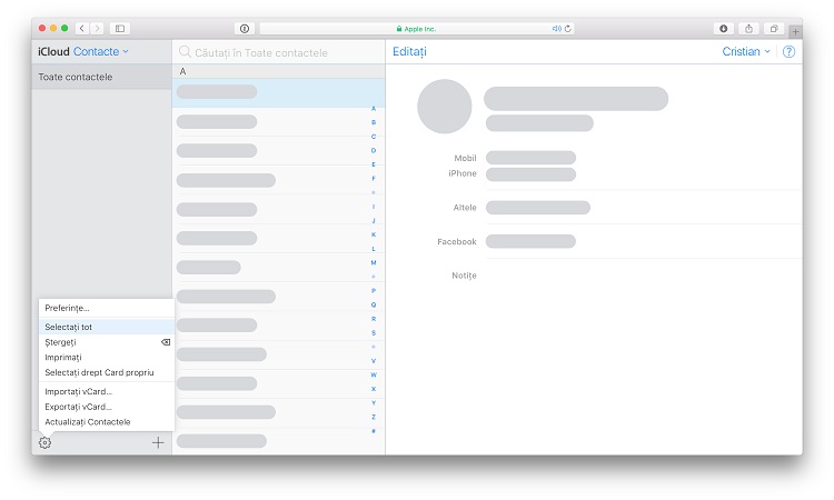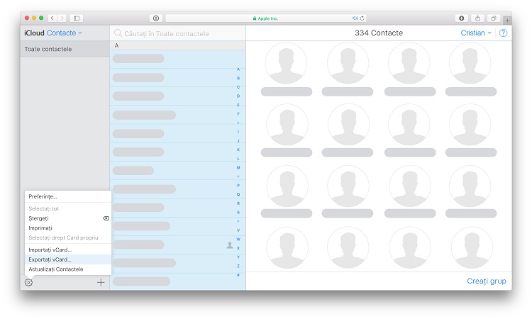 4. Click încă o dată pe iconița de Settings și alegeți “Exportați vCard…”. Procesul de export va putea dura cateva zeci de secunde, depinzând foarte mult de cât de multe contacte aveți în iCloud. La final se va download-a un fisier vcf care va conține toate contactele din iCloud.