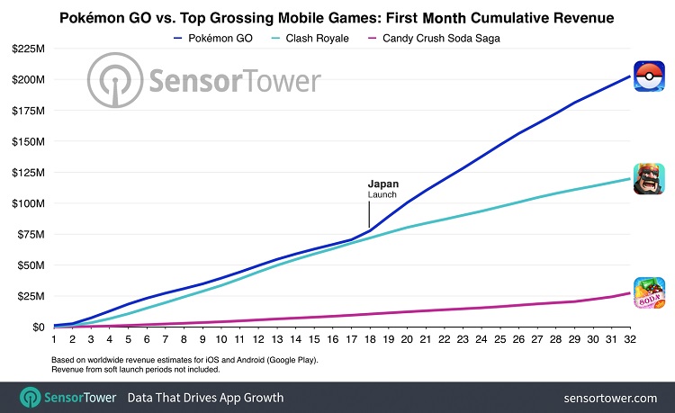 Ghidându-se parcă după principiul “Câinii latră, ursul trece!”, Pokemon Go își vede liniștit de drumul său, unul care duce înspre tot mai multe dispozitive mobile de-ale utilizatorilor, unul care aduce tot mai multe încasări companiei care a produs acest titlu. Conform celor de la Sensor Tower, o companie de analiză financiară specializată pe jocuri cu achiziții in-app, Pokemon Go a strâns 200 de milioane de dolari doar în prima lună de viață. Adică dublul valorii pe care a reușit să o adune următorul clasat în top, Clash Royale. Până la urmă a avut câțiva utilizatori care au contribuit generos la realizarea acestei sume totale.