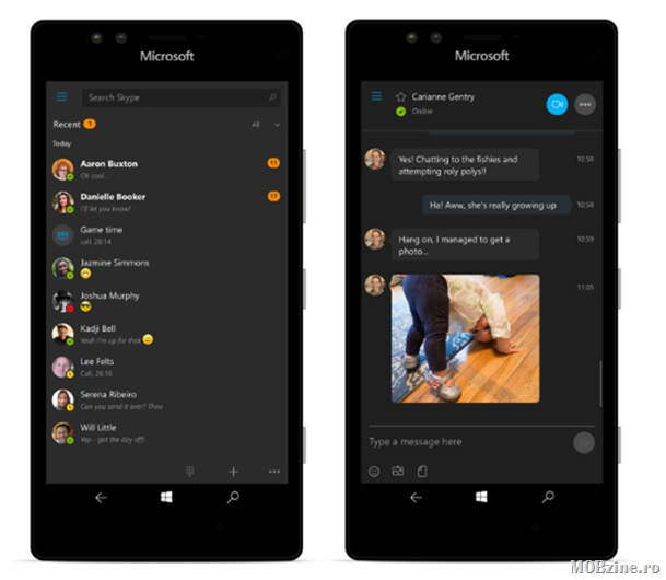 Dacă înainte de update-ul către Windows 10 Mobile Anniversary Update aveați vechiul Skype, acum veți descoperi o aplicație redesenată, care se mișcă mai bine și care se integrează mai mult cu sistemul de operare. În timp ce purtați convorbirile Skype aveți acces la instoricul mesajelor, puteți partaja fotografii și trimite emoji-uri.