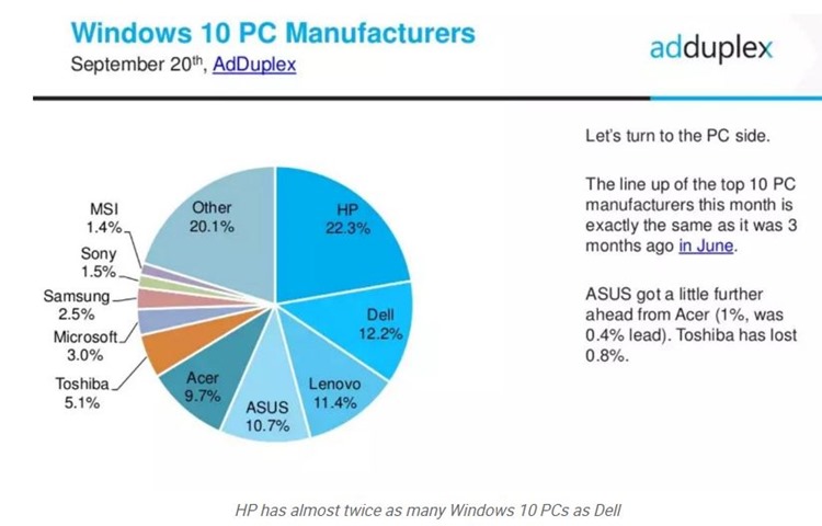 În ceea ce privește harwdare-ul pe care funcționează Windows 10, HP e lider, urmat de Dell, Lenovo, ASUS, Acer și la distanță mare Toshiba, Sony, Samsung, MSI.