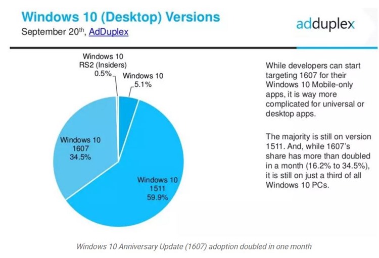 Imediat ne apropiem de aniversarea a două luni de când noul Windows 10 Anniversary Update (build-ul 1607) a fost lansat oficial de către Microsoft și este instalat gratuit de toți utilizatorii de Windows 10. Dacă în prima lună de la lansare doar 16,2% din baza de Windows 10 trecuse pe Windows 10 AU, acum, la două luni, cota a ajuns la 34,5%, mai mult decât dublu, practic unul din trei PC-uri ce are Windows 10 a trecut pe Windows 10 Anniversary Update.