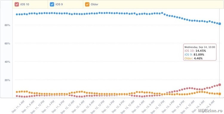 Acum, conform datelor oferite de Mixpanel, iOS 10 are o cotă de piață de 14,45%, iOS 9 e în scădere continuă (puțin peste 81%), celelalte versiuni rămânând relativ constante ca și cotă de piață – apropo de asta, iPad-ul de generația a treia de exemplu, nu mai primește upgrade.