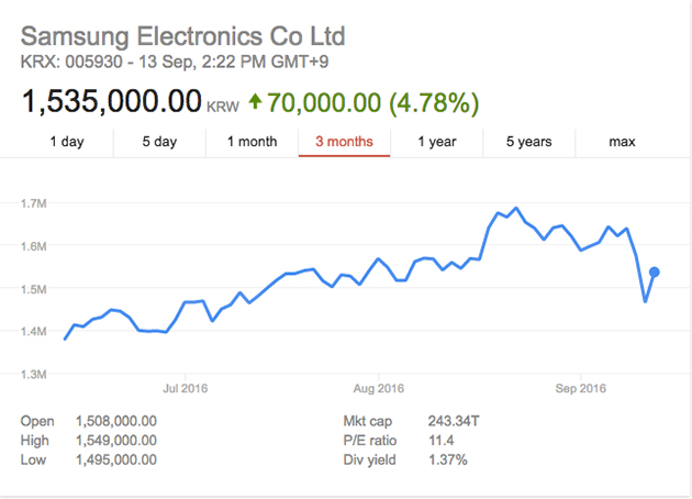 Urmarea este că investitorii și-au pierdut încrederea în Samsung și au început să vândă din acțiuni, coreenii pierzând deja 26 miliarde de USD ca urmare a scăderii prețului acțiunilor. În momentul de față prețul acțiunilor se află la cel mai mic nivel al ultimelor luni, puțin peste $1,300.