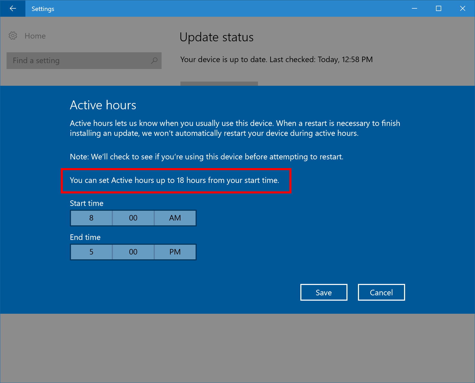 7. Perioada Active Hours a fost extinsă acum la 18 ore ca să vină în întâmpinarea celor ce folosesc calculatorul intensiv, în special cei din mediile enterprise.