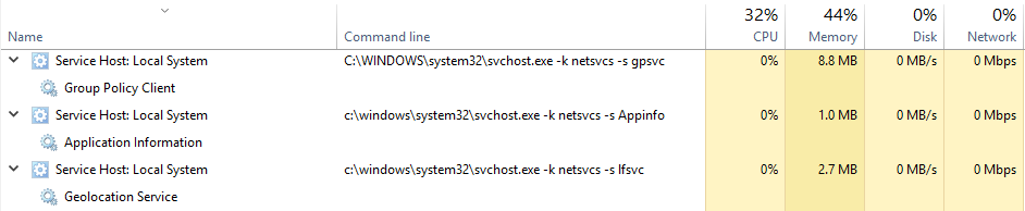 - REG ADD HKLM\SYSTEM\CurrentControlSet\Services\WAS /v SvcHostSplitDisable /t REG_DWORD /d 1 /f