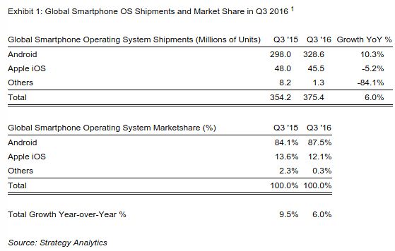 Și, poate și mai important, în afară de iOS restul chiar nu mai contează (dacă au contat vreodată). Asta mi se pare cumva și mai grav în studiul celor de la Strategy Analytics, că în afară de Android și iOS, restul sistemelorde operare pe zona de smartphone au scăzut la cantitatea neglijabilă deja de 0,3% cotă de piață în al treilea trimestru al lui 2016.
