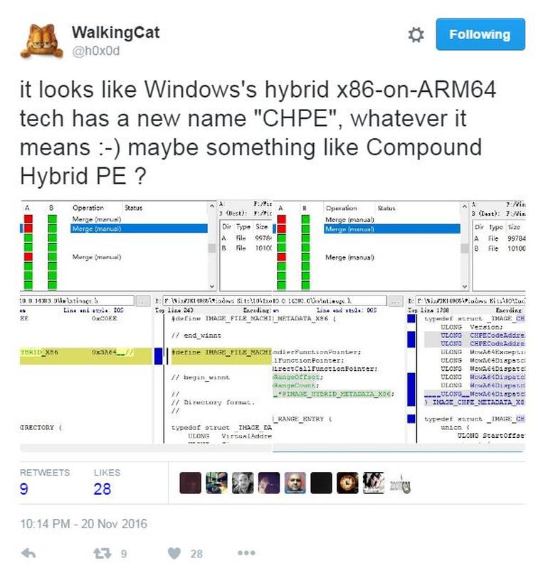 Ieri, WalkingCat (@h0x0d) a dat pe Twitter un mesaj în care anunță că a descoperit referințe în Windows pentru CHPE. Windows hybrid x86-on-ARM64.