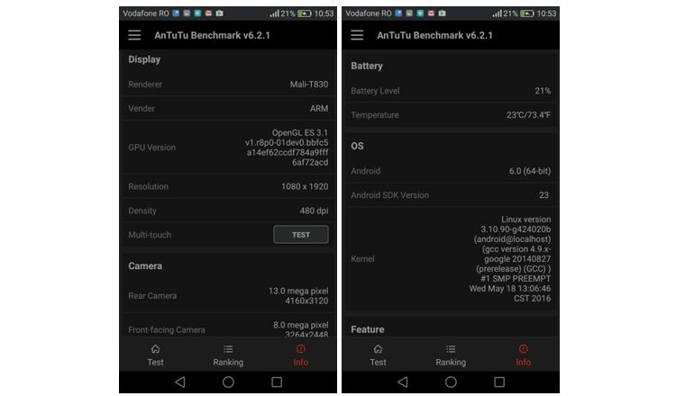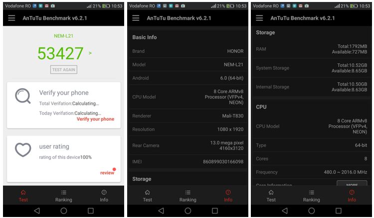Din punctul de vedere al performanțelor, mergem și pe varianta AnTuTu Benchmark, pentru amatorii de cifre seci, cu rezultate așa cum se poate vedea mai jos. De menționat că Honor 7 Lite a scos un scor puțin mai mare decât cel al lui Huawei P9 lite. Însă eu le consider relative, așa că nu cred că trebuie să ținem prea mult cont de ele.