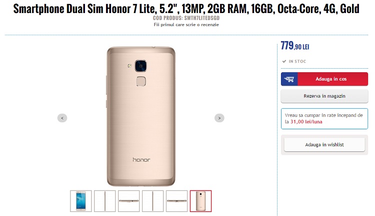 Prima surpriză mare vine din partea prețului. Honor 7 Lite în versiunea cu cititor de amprentă digitală și culoare aurie (exact ca cea testată de noi) costă 779 de lei la Media Galaxy. Un preț excelent, care s-ar putea să fie mai mic tocmai pentru că suntem încă în preajma Black Friday-ului.