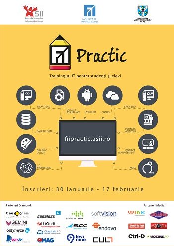 FII Practic este un proiect organizat de Facultatea de Informatică Iași împreună cu Asociația Studenților Informaticieni Ieșeni, care a ajuns anul acesta la cea de-a VI-a ediție. Evenimentul revine în forță, pregătit să le ofere elevilor și studenților pasionați de IT&C, project & bussiness management cunoștințe noi, prin intermediul unor training-uri susținute de persoane cu experiență, atât din mediul academic, cât și din cel corporatist. Totodată, proiectul promovează educația non-formală prin îmbinarea celor două medii.
