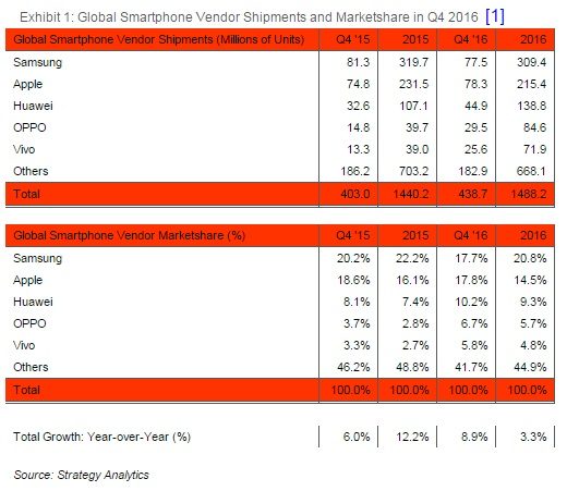 De notat că doar la nivel de al patrulea trimestru se înregistrează această situație. Pentru tot anul, dominarea Samsung este evidentă, chiar și în studiul celor de la Strategy Analytics. Samsung a reușit să livreze în tot anul 2016 nu mai puțin de 309,4 milioane de unități, având o cotă de piață de 20,8%, în timp ce Apple a livrat 215,4 milioane de iPhone-uri, având o cotă de piață de 14,5%.