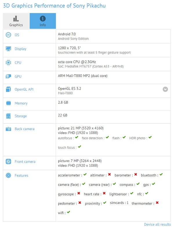 Este misterios în primul rând prin numele de cod pe care îl poartă: Pikachu. În mod normal, denumirea comercială va fi alta, dar nu ar fi excluse nici surprizele. Până la urmă, strategia de marketing a japonezilor de la Sony a fost destul de constantă și nu s-a dovedit a fi obligatoriu câștigătoare, așa că puțină schimbare nu ar strica. Dar până la confirmarea sau infirmarea denumirii acestui smartphone, rămân specificațiile care au ieșit la iveală după ce terminalul a apărut în baza de date a GFXBench. Înspre aceste detalii se va îndrepta atenția noastră în cele ce urmează.