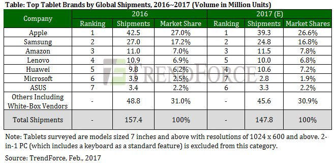 O analiză rapidă ne arată că piața de tablete a scăzut și în 2016 cu încă 6,6% față de anul precedent. Același trend este preconizat de către analiștii de la TrendForce și pentru 2017. În anul care tocmai s-a încheiat, marile nume au scăzut și ele. Apple, spre exemplu, în ciuda faptului că își păstrează poziția de lider la nivel global, a scăzut cu 14,1 procente față de 2015. Nici Samsung nu a fost mai fericit, compania a reușit să vândă doar 27 de milioane de unități anul trecut. Din acest studiu au fost excluse laptop-urile 2 în 1 care au ecran touch și pot fi folosite și ca tablete.