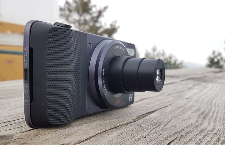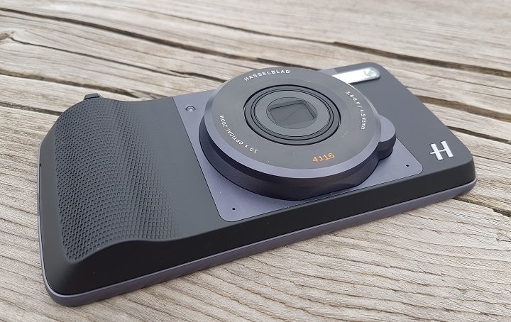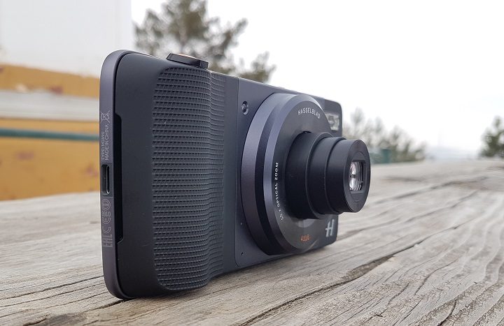 Primul și cel mai spectaculos dintre Moto Mods este fără îndoială modulul foto realizat în colaborare cu Hasselblad. În ciuda faptului că îi conferă un plus notabil de grosime și de greutate terminalului, nu este imposibil de folosit.