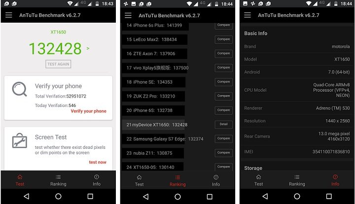 Mai fac o scurtă paranteză înainte de a trece la argumentele lui Moto Z și o să vorbesc de performanțele telefonului, care sunt în strânsă legătură cu configurația enumerată ceva mai sus. Așa că este momentul pentru capturile de ecran din AnTuTu Benchmark, acolo unde vedem că terminalul nostru stă destul de bine și se poziționează într-o companie selectă. Ba chiar scoate un rezultat peste cel al lui Huawei P10 proaspăt testat de Ionuț, un flagship mult mai recent.