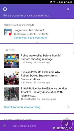 Cortana poate răspunde la întrebări, seta alarme, răspunde la întrebări, mai bine ca Siri sau Google Assistant. În plus afișează și informații relevante despre activitățile zilnice, știri etc.