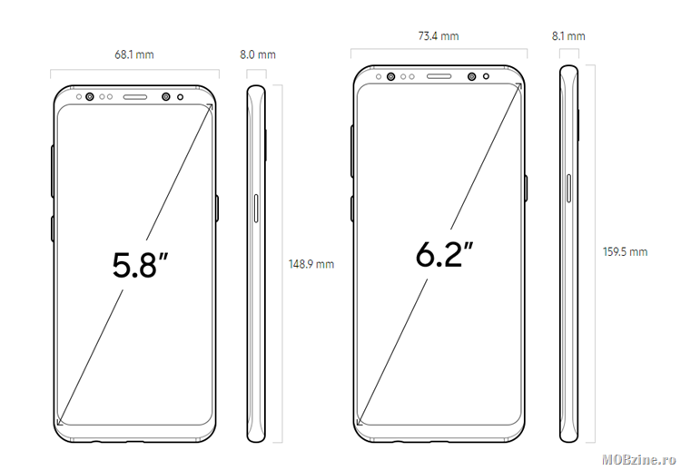 S8 vine cu un display de 5.8 inci, S8+ are 6.2 inci. Asta înseamnă carcase de 148,9 x 68,1 x 8 mm, respectiv 159,5 x 73,4 x 8,1 mm. Ambele au rezoluție de 2960 x 1440 pixeli, diferă densitatea: 570 ppi pentru S8, respectiv 529 ppi pentru S8+.