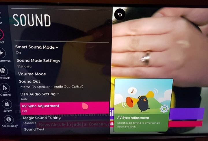 Ca o scurtă paranteză, tot în meniul principal de sunet al televizorului (Sound), aveți și opțiunea de a regla timing-ul între semnalul audio și cel video, atunci când apar decalări între cele două (AV Sync Adjustment).