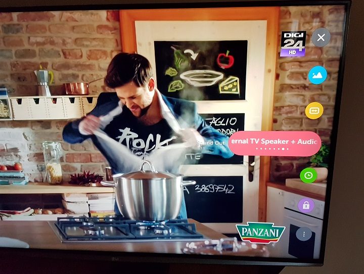 O variantă ar fi prin intermediul meniului rapid care poate fi apelat direct de pe telecomanda LG Magic Remote și care este afișat pe laterala din dreapta a ecranului. În cadrul acestui meniu, la partea de sunet, se afișează direct opțiunile de ieșire a sunetului, din care trebuie să selectăm Internal TV Speaker + Audio Out (Optical).