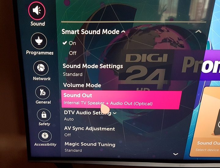 Cealaltă variantă presupune intrarea în meniul principal al televizorului, apoi în submeniul dedicat sunetului (Sound) și apoi în alegerea căii de ieșire a sunetului (Sound Out).