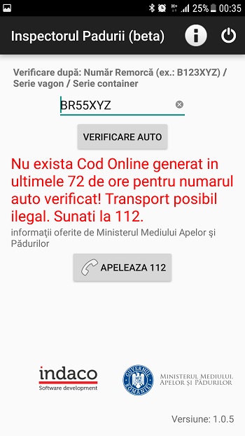 În eventualitatea în care transportul nu este autorizat în ultimele 72 de ore, aplicația notifică utilizatorul și îi oferă posibilitatea apelării rapide, prin telefon, a numărului de urgență 112. Ceea ce ar trebui să și faceți, pentru că sunt șanse mari ca transportul respectiv să fie ilegal. Și asta se întâmplă de cele mai multe ori în urma unor operațiuni ilegale de tăiere. (Pentru exemplificare, am folosit un număr de înmatriculare la întâmplare).