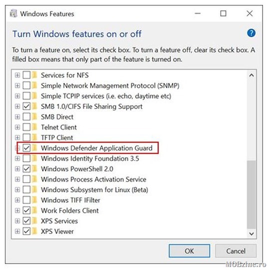 Windows Defender Application Guard: opțiunea e disponibilă în Edge aducând un grad mai ridicat de protecție pentru sistemele din rețelele corporate și necesită prezența Windows Enterprise Edition și a Hyper-V.