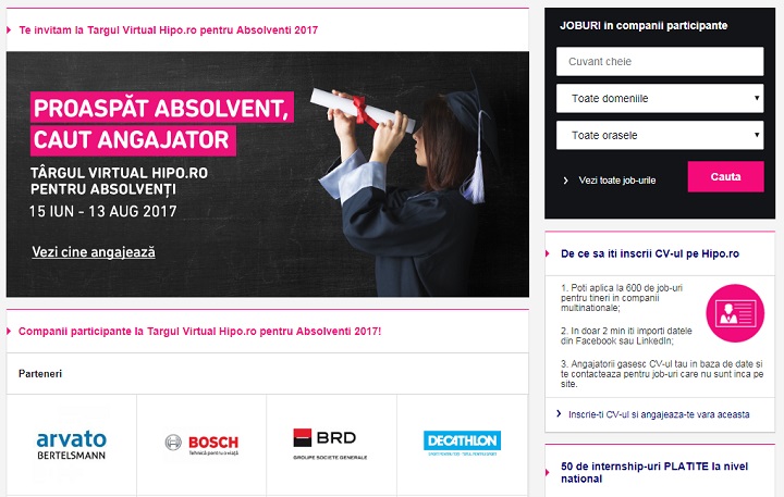 Targul Virtual Hipo.ro pentru Absolventi aduna la un singur loc cele mai atractive joburi si programe de internship deschise de companii dispuse sa investeasca in tineri cu potential. Lipsa experientei anterioare nu mai este un obstacol deoarece majoritatea companiilor ofera si programe de training si dezvoltare profesionala la locul de munca.