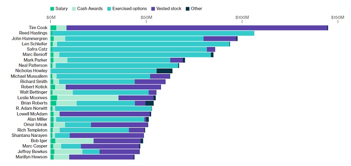 Asta face ca CEO-ul Apple să fie cel mai bine plătit din zona companiilor publice S&P 500 (un indice bursier prin care Standard & Poor’s clasifică cele mai mari 500 de companii, majoritatea americane). Și se întâmplă pe bună dreptate, pentru că Apple este o companie extrem de profitabilă pentru acționari și care pare a avea un traseu bine stabilit și ascendent. Așa că faptul că totalul câștigurilor lui Tim Cook în calitate de CEO Apple nu ar trebui să mire pe nimeni.